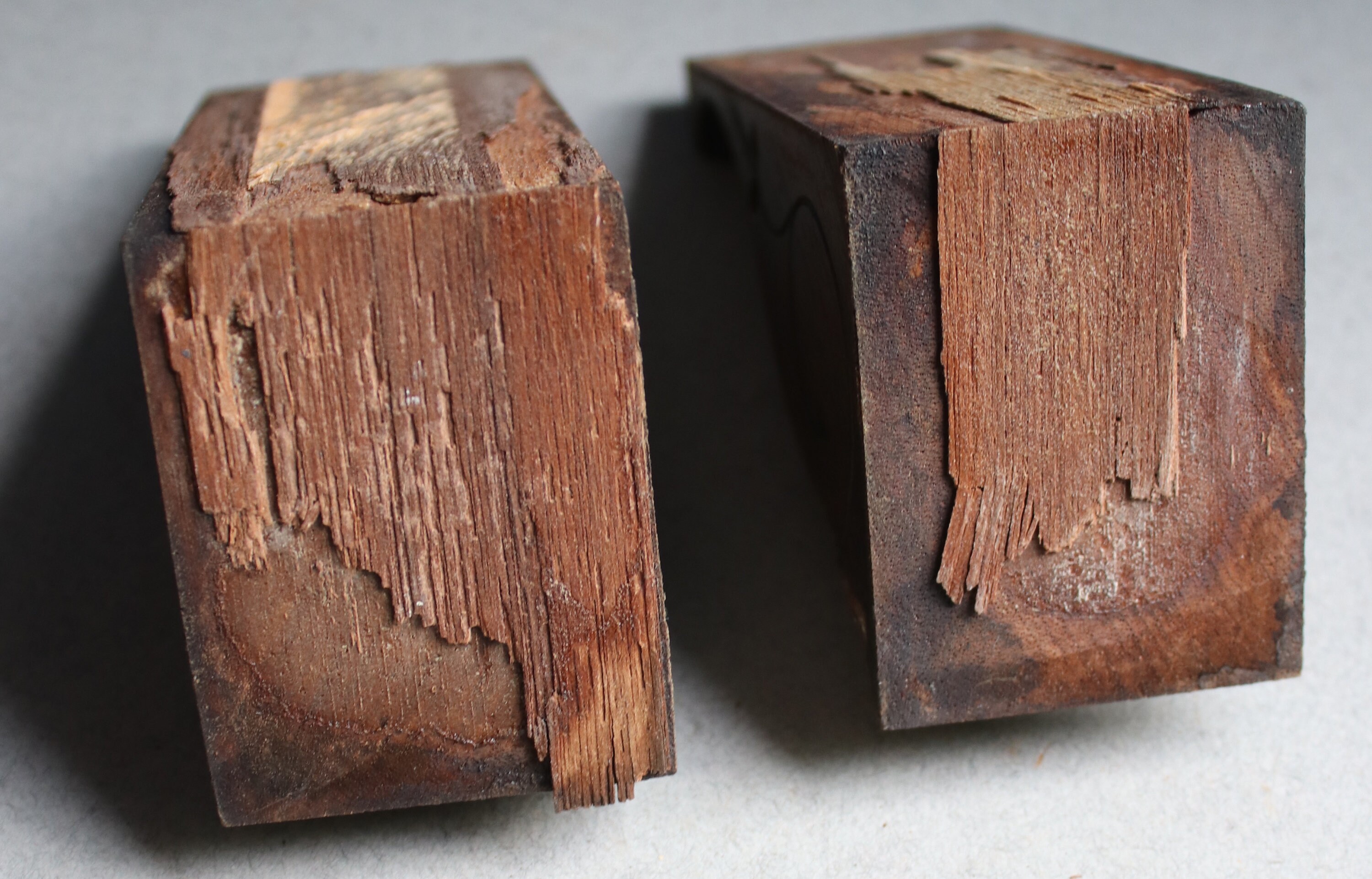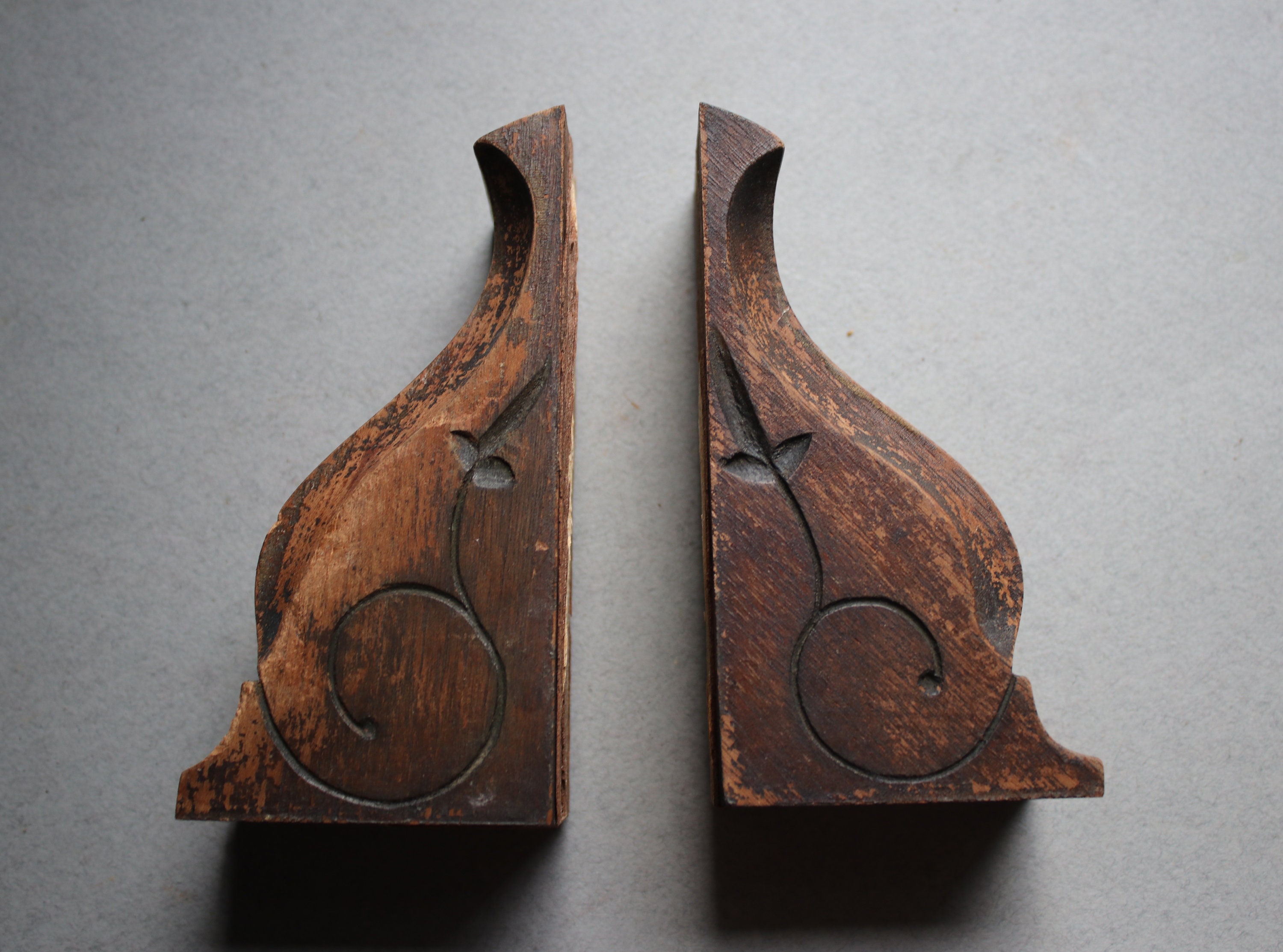 These two pieces of architectural molding known as corbels are comprised of wood that has designs carved into them. The pieces are lightweight and measure 5 ⅛" and 5 ¼" in height. Although there is a ¼" discrepancy in height between the two pieces, this is not readily apparent when the pieces are displayed as in the last photo.
