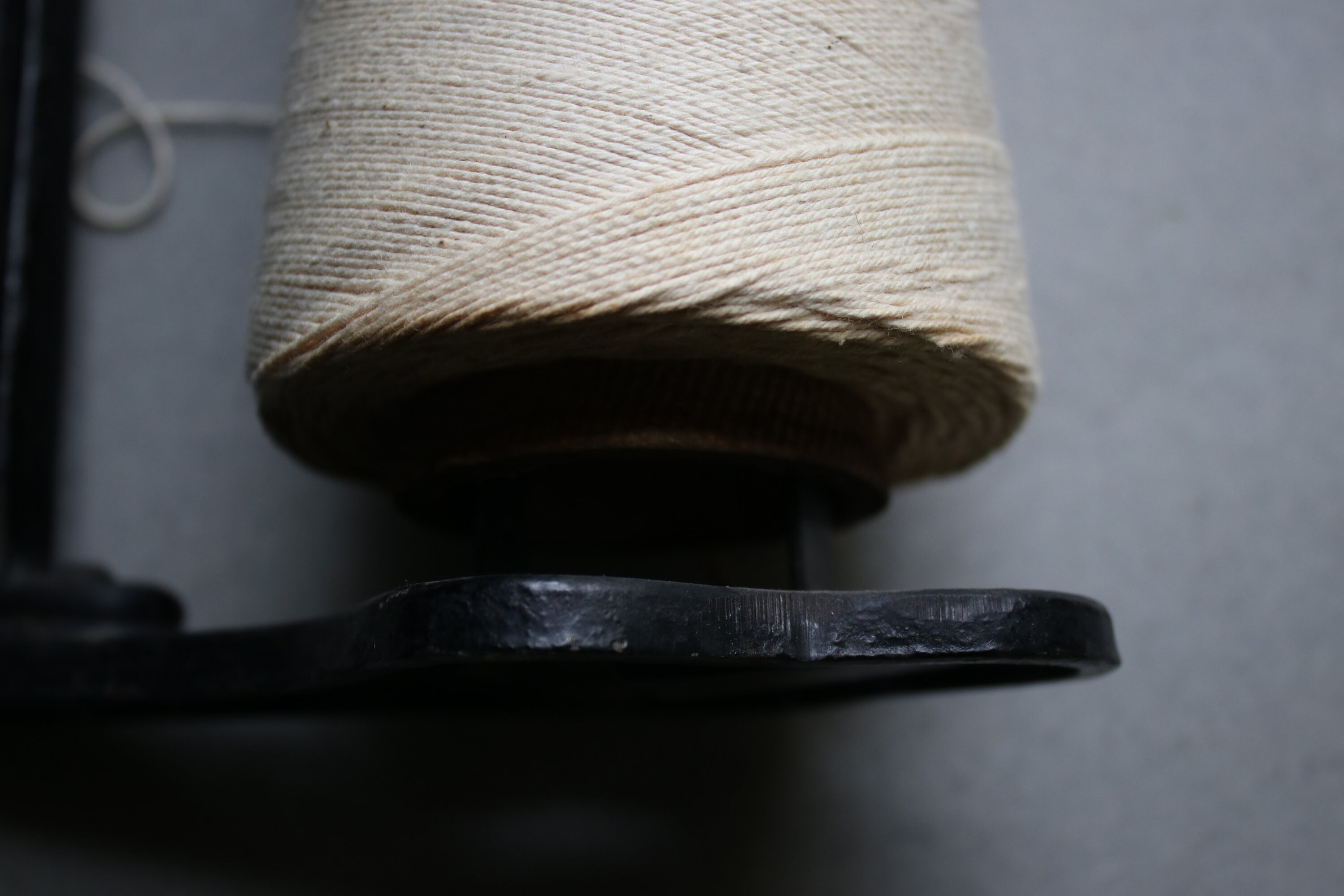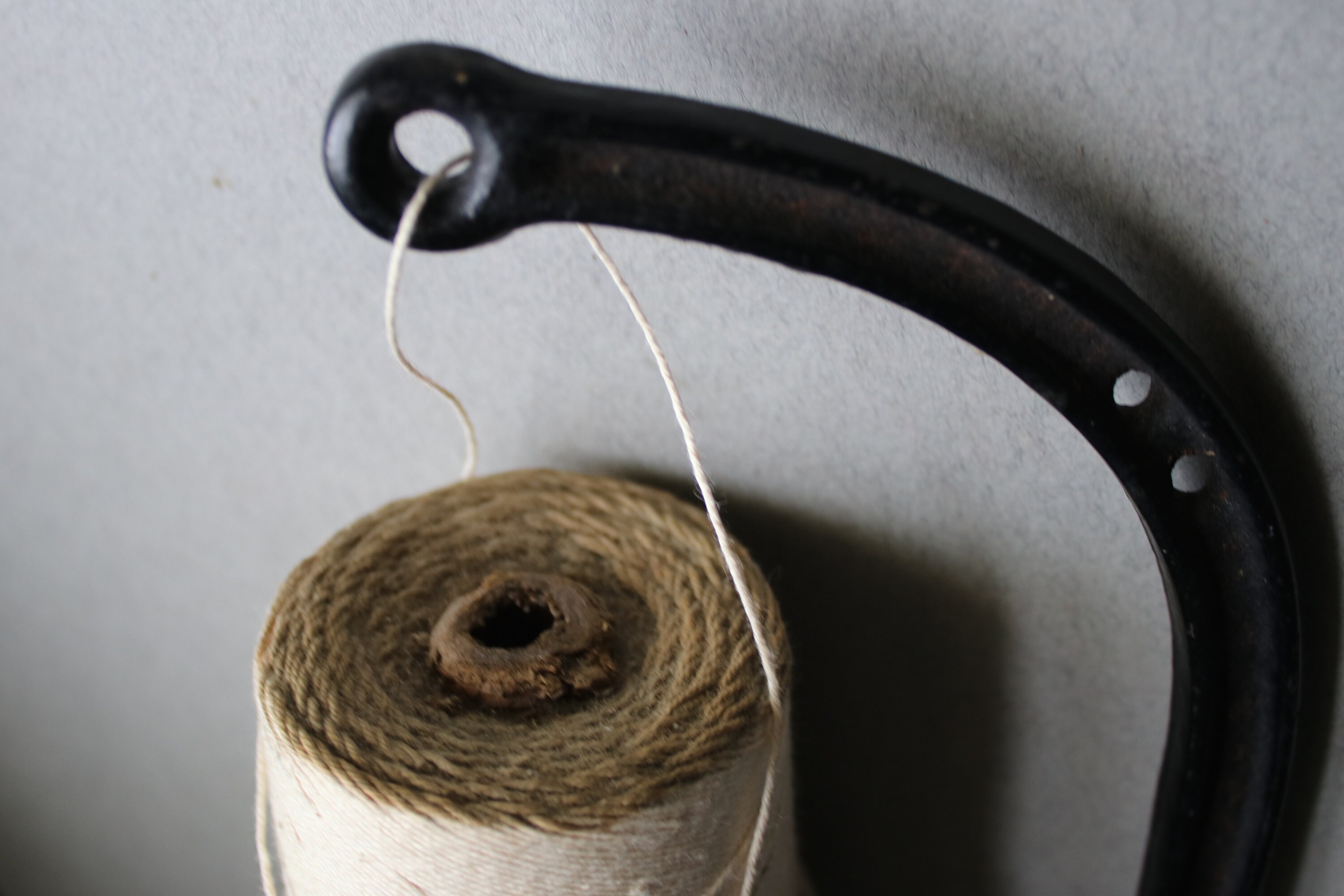 This string holder measures 10 1/4" in height with a 6 1/4" x 3 1/2" base. The cast iron has a patina and the spool of string, which is included, is dusty.
