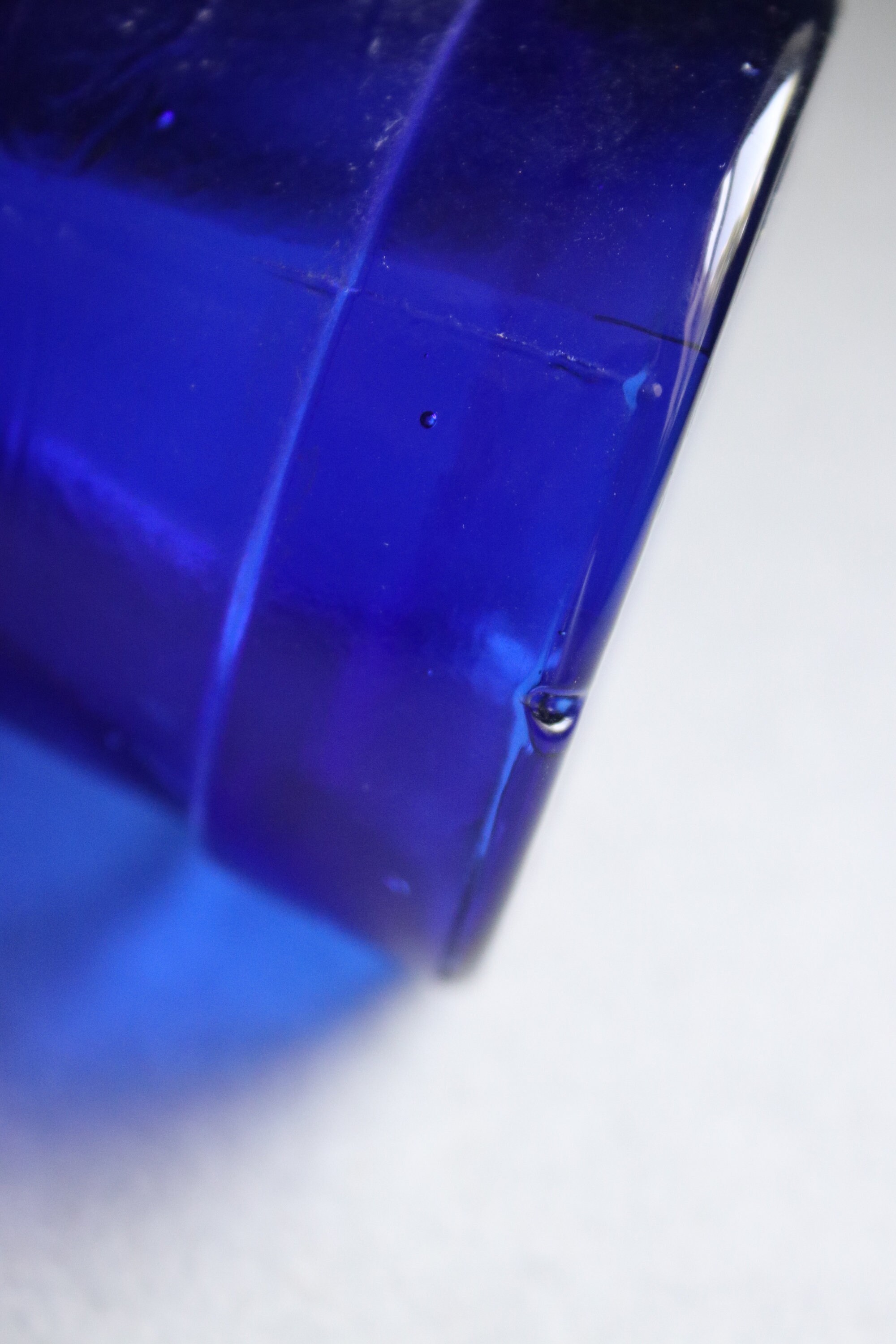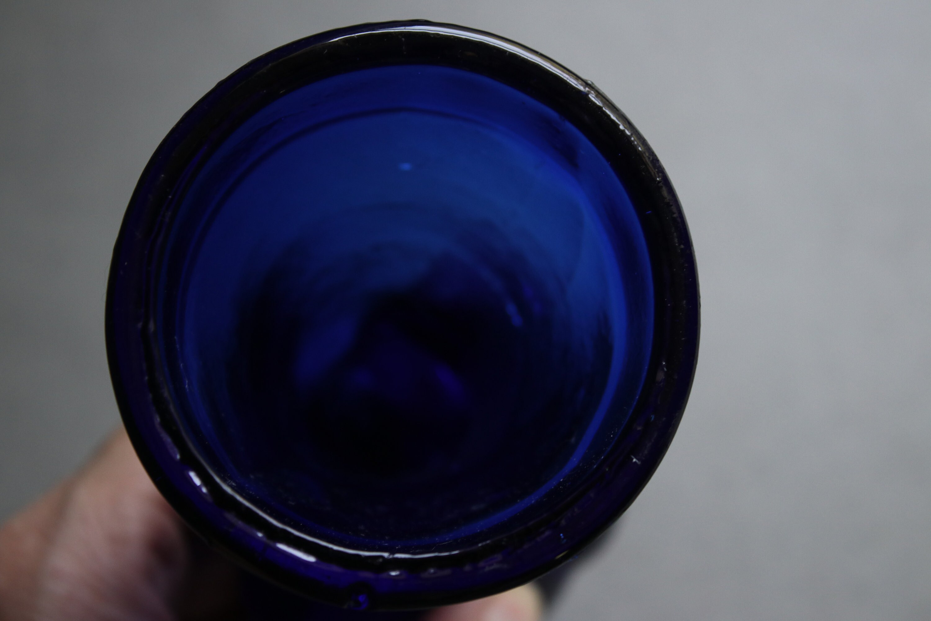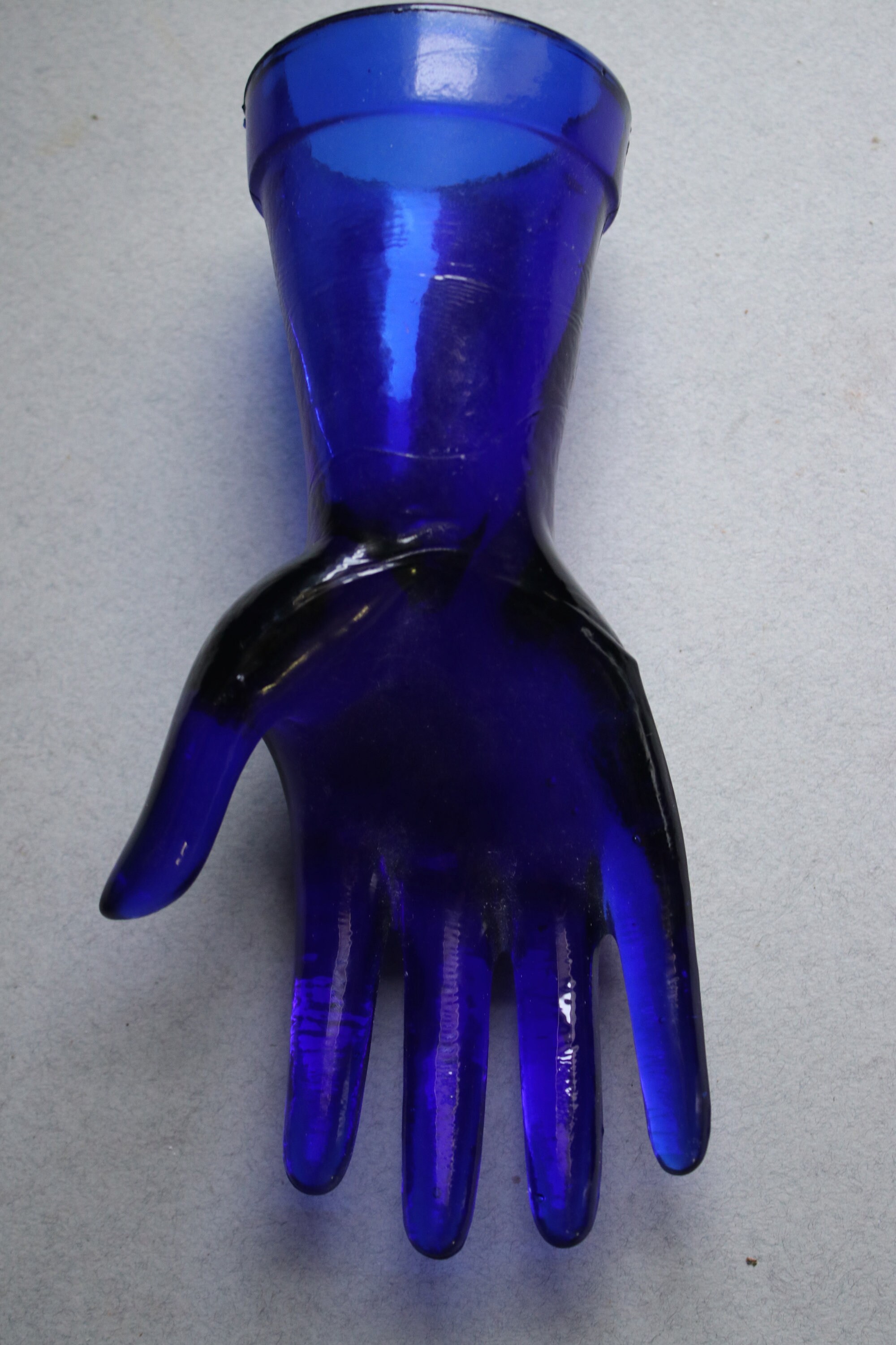 This cobalt blue glass display hand has no chips or cracks. There is a place, as seen in the sixth photo, that looks like a mold imperfection as the area is not jagged as a chipped area would be but smooth. Also, there are lines and creases as well as bubbles in the glass as seen in most of the photos. This is owing to the manufacturing process. Do let me know if you'd like more photos as I'll be happy to oblige.