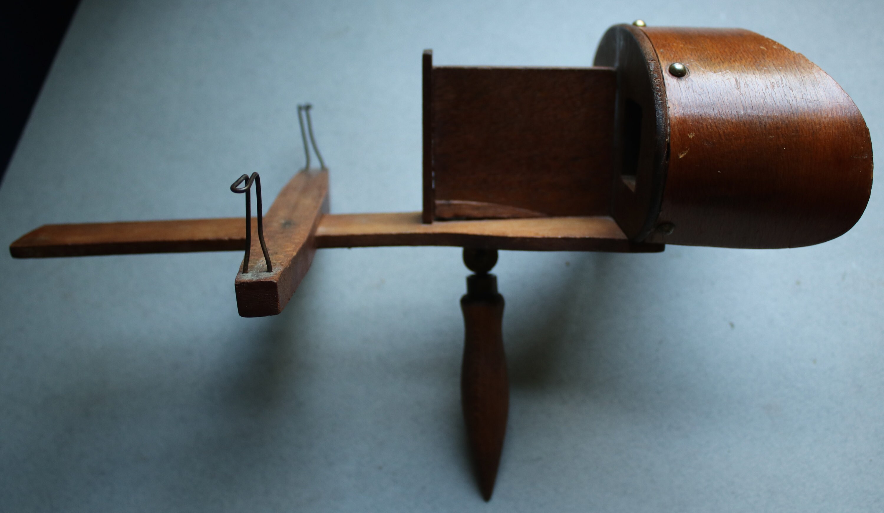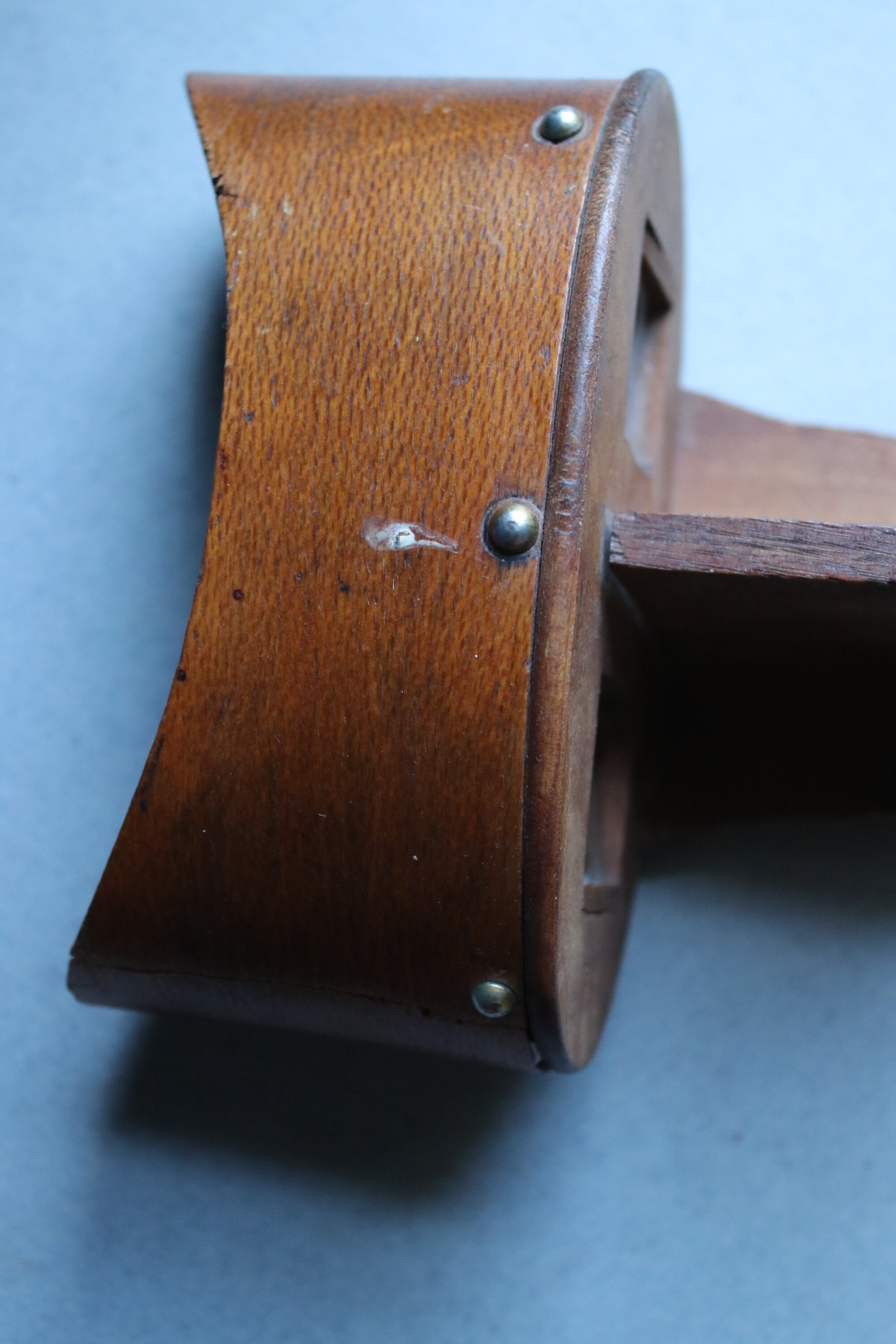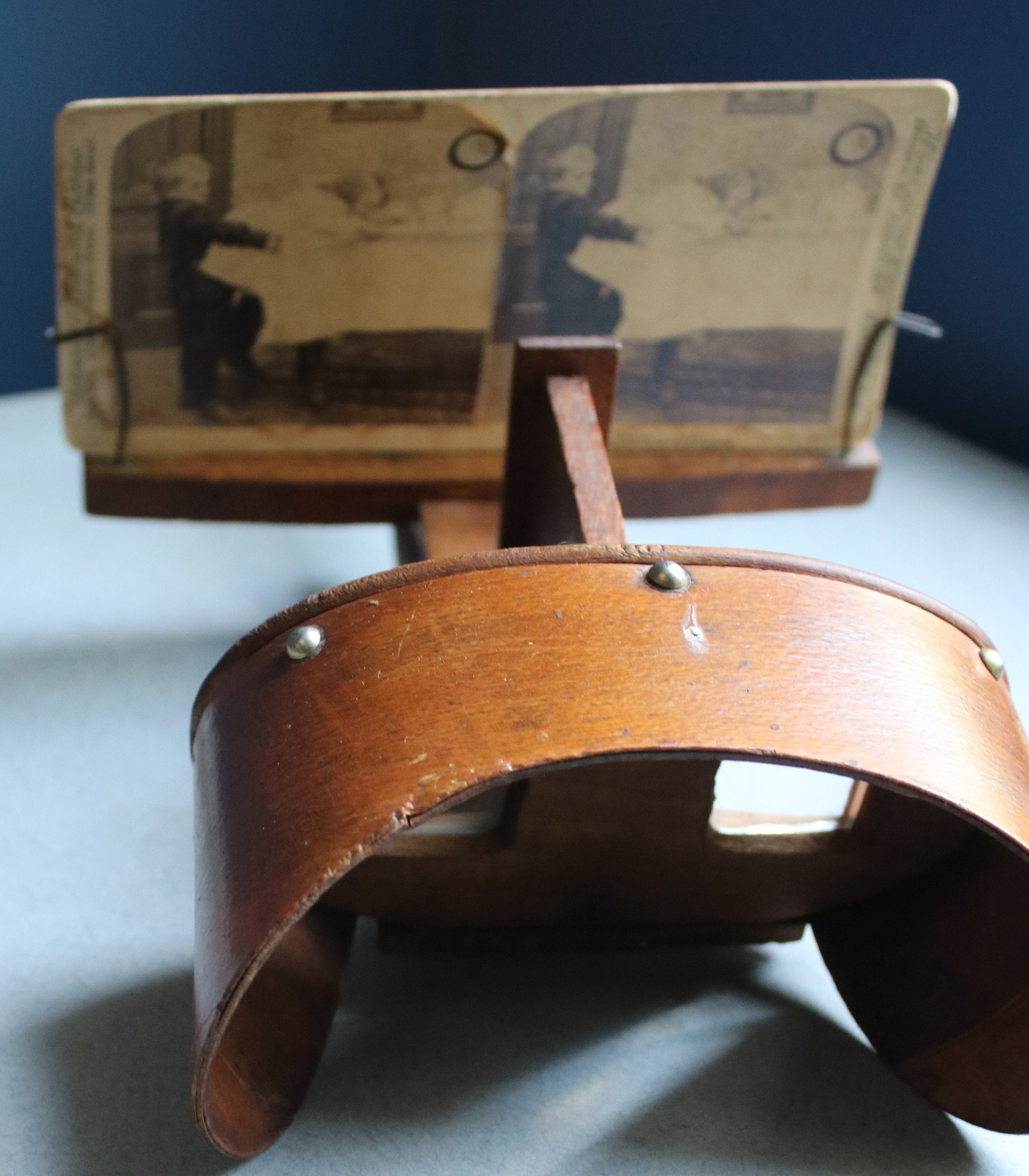 This more than likely antique, circa late 1800s stereoscope viewer is comprised of wood and metal parts. It measures approximately 12.5" in length and has two reasonably clear magnifiers through which to view stereo view cards. I'm including one card in this sale.