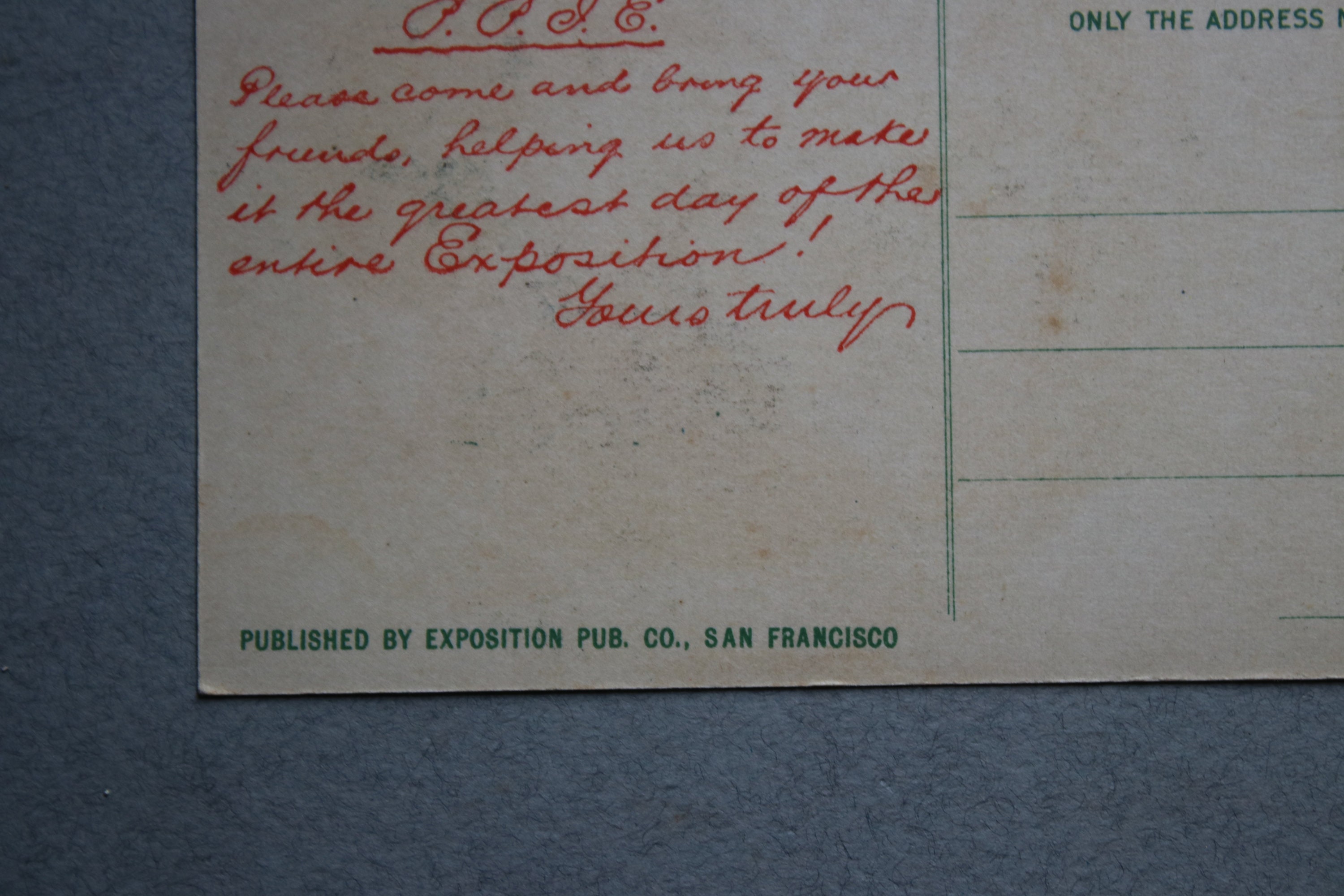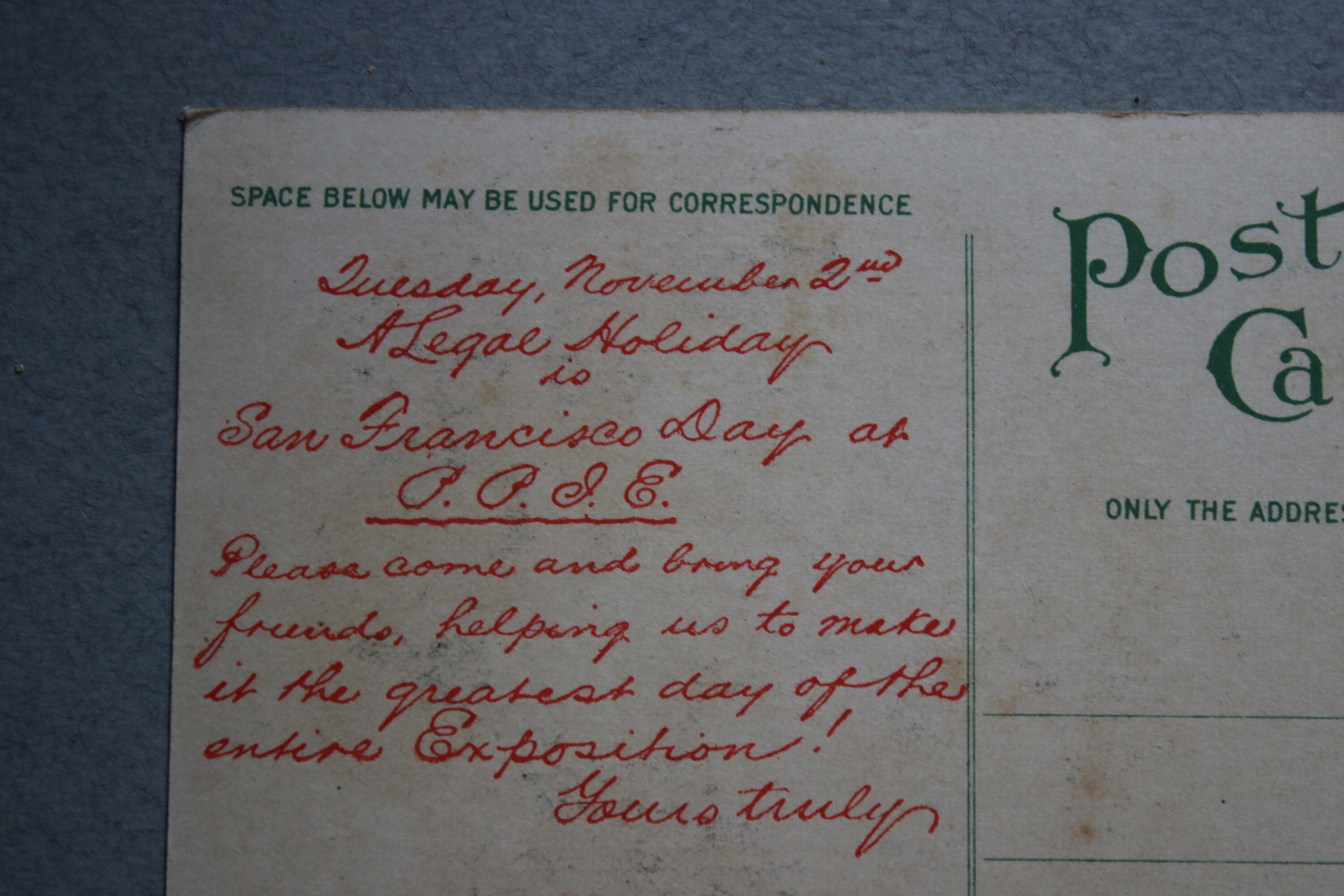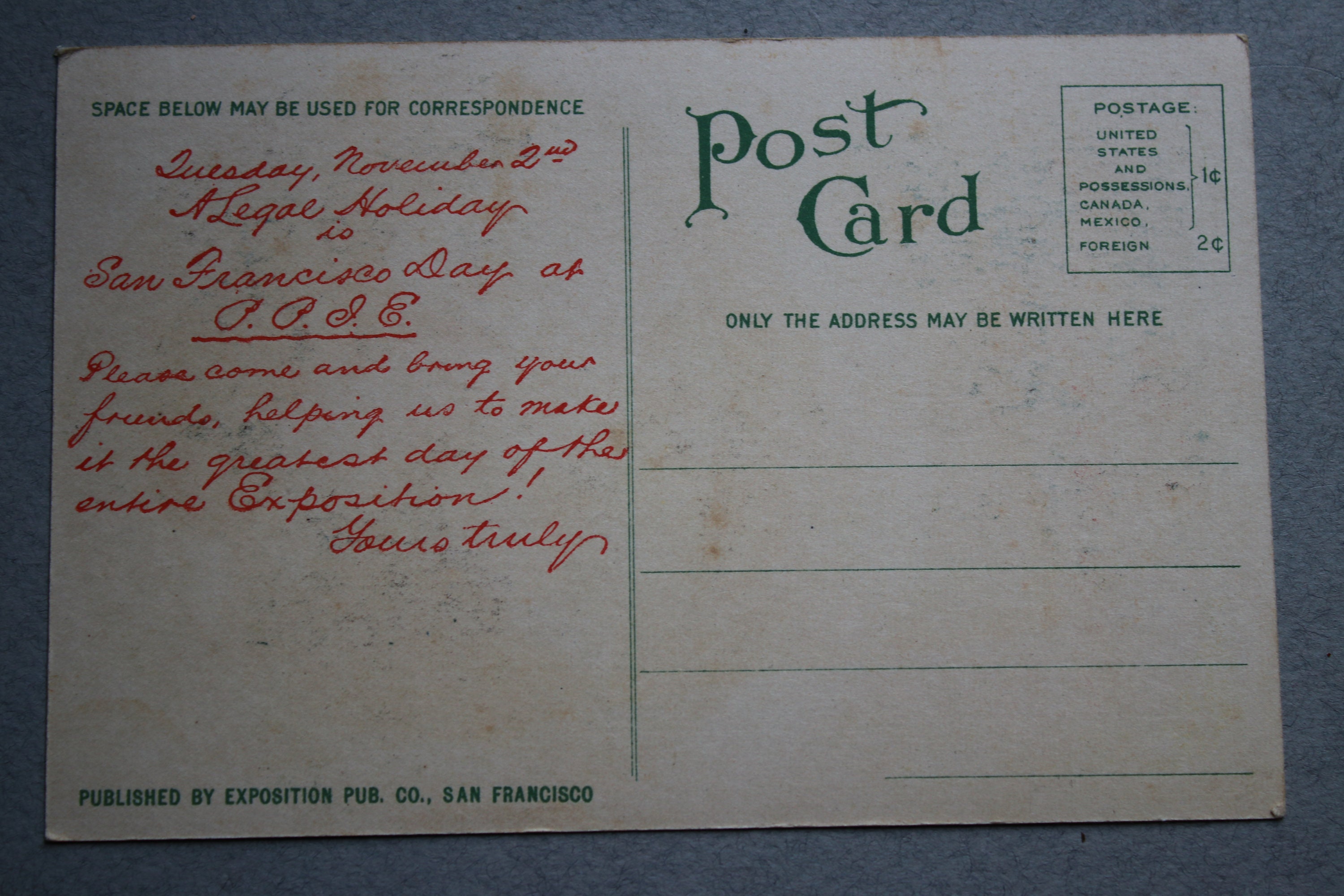 Message on back, perhaps preprinted (but I am uncertain), encouraging people to attend the exposition on San Francisco Day.