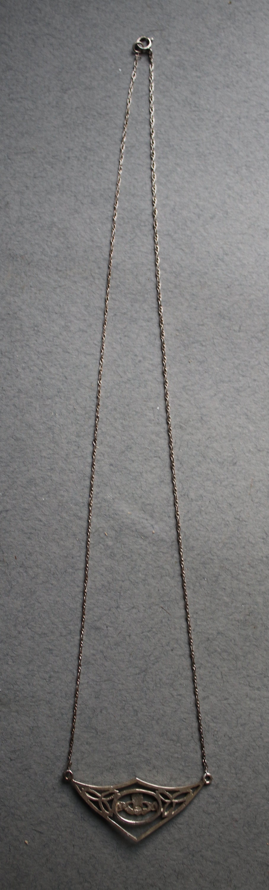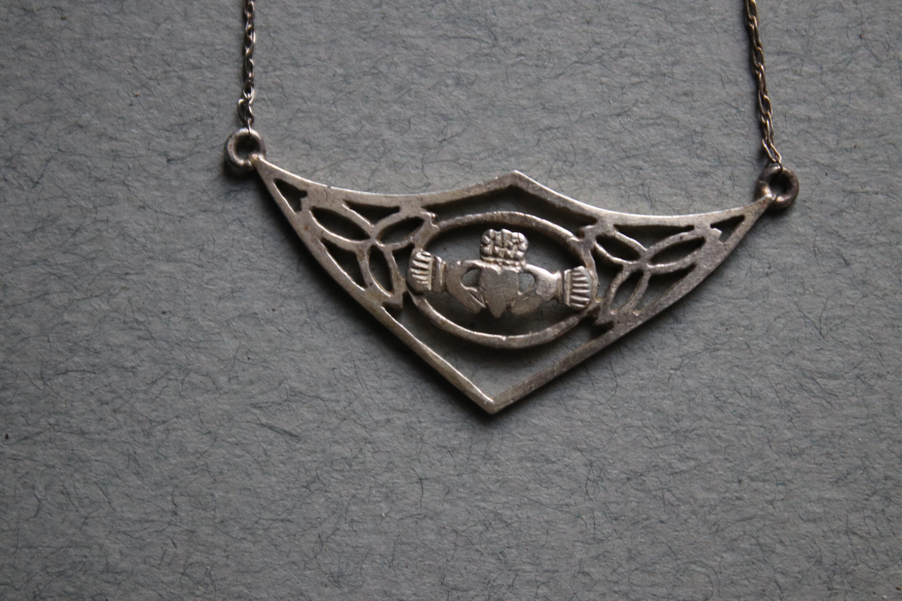 This sterling silver Irish Claddagh necklace measures 18.50". Length, straight down the center, from clasp to end of pendant is 9.25". I've not polished this piece but will leave this up to the discretion of its new owner.