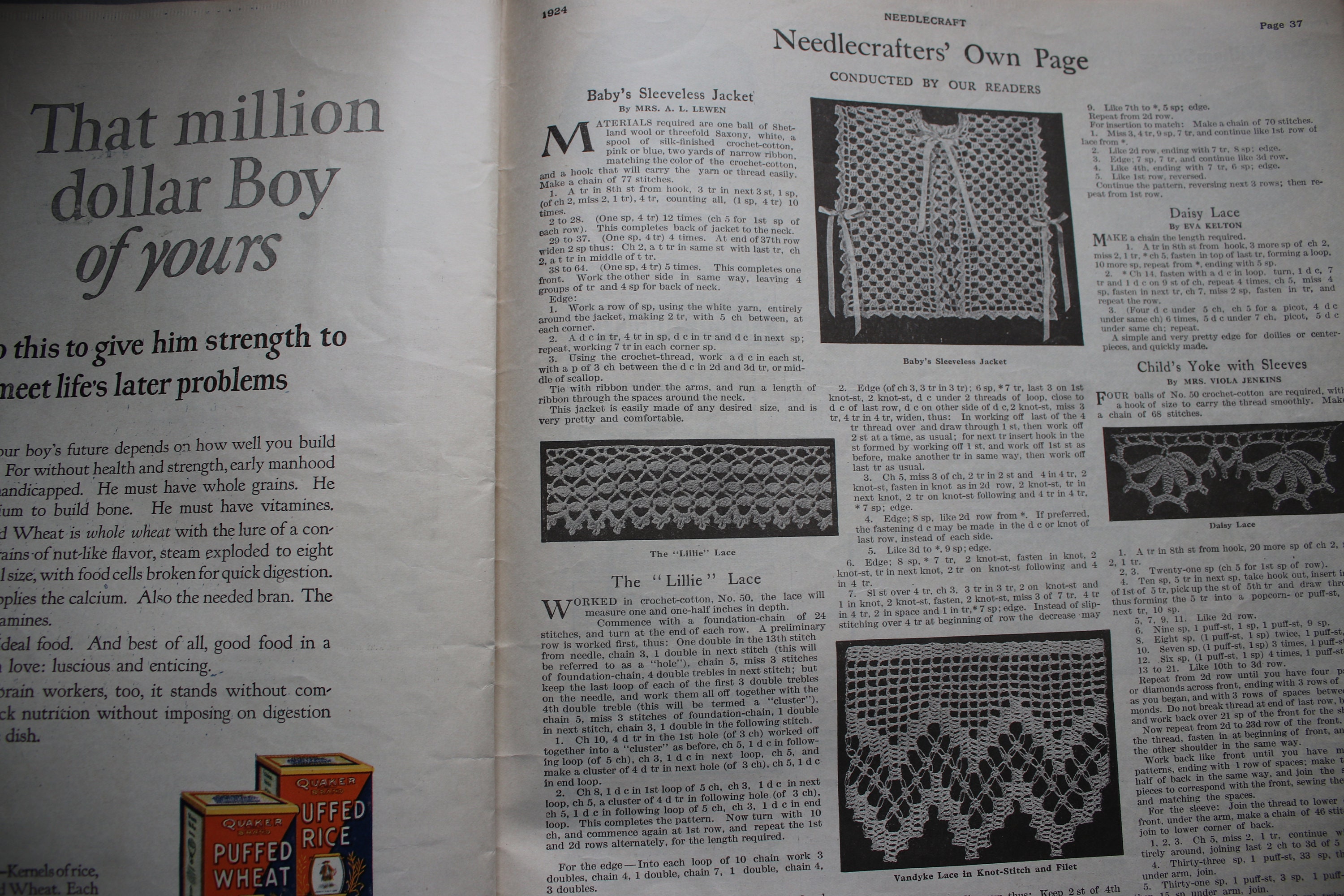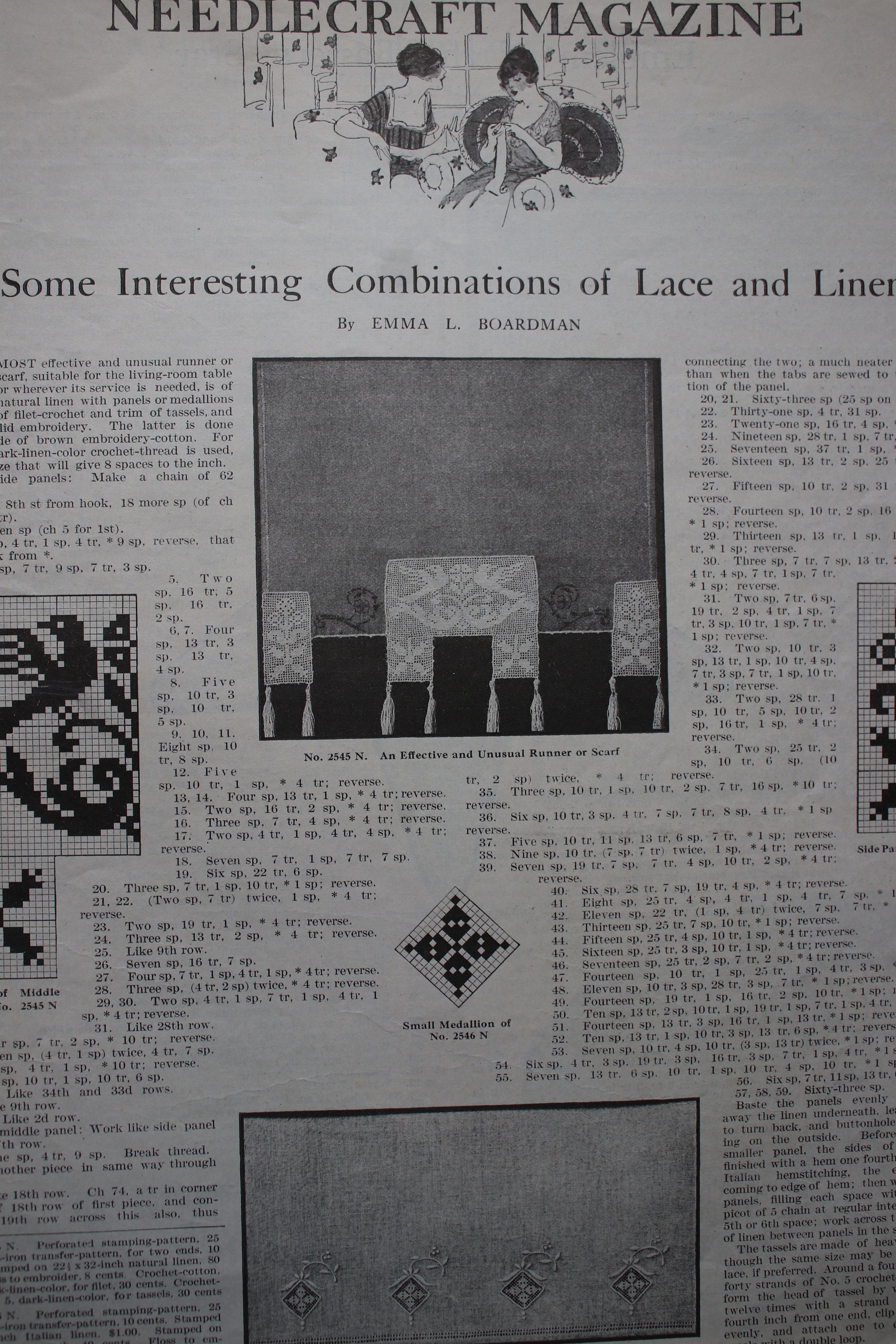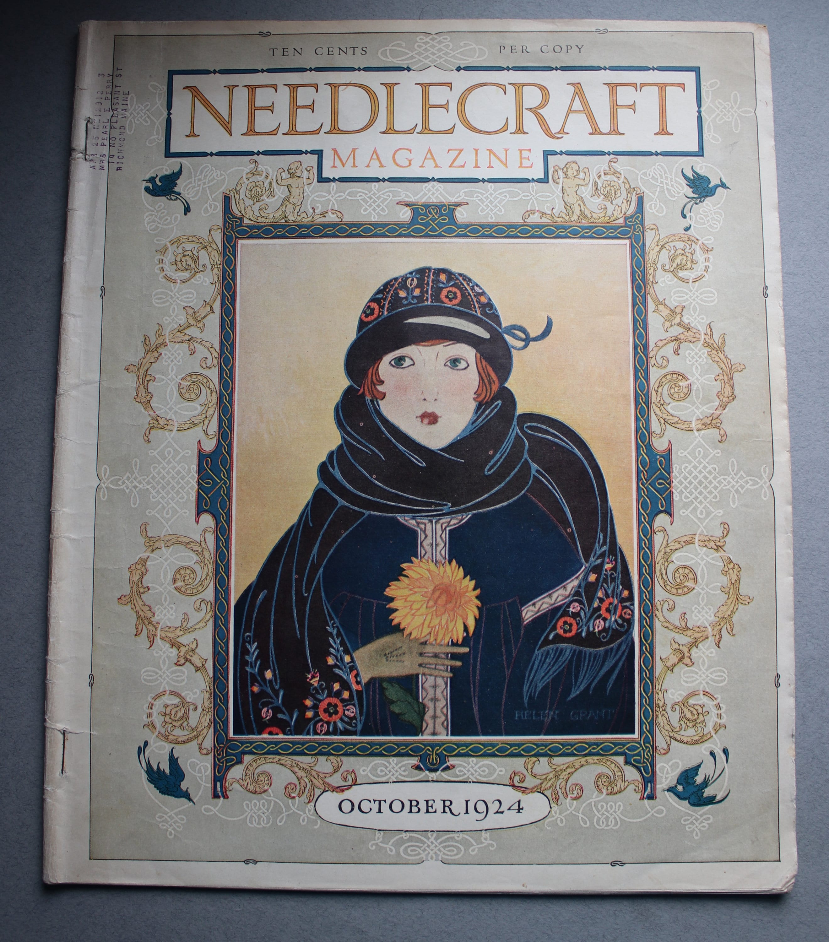 This October 1924 Needlecraft Magazine has 48 pages, counting the front and back covers. Pages 5-6 have a tear on the edge that is approximately 1" across horizontally. The cover has light soiling, and there is some light, dog-earing of page edges. Other than these issues, the magazine is intact and unmarked and contains all its pages.