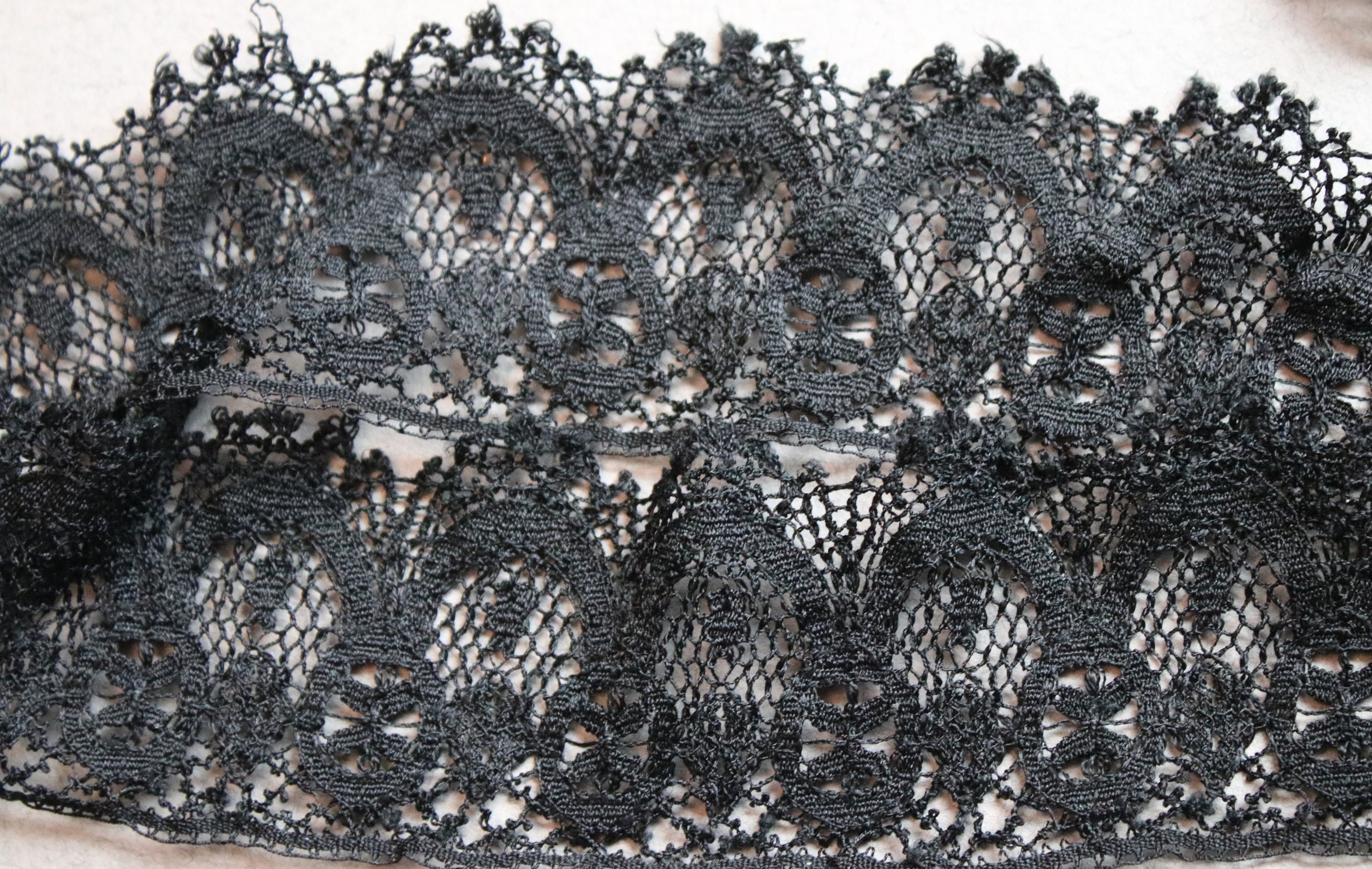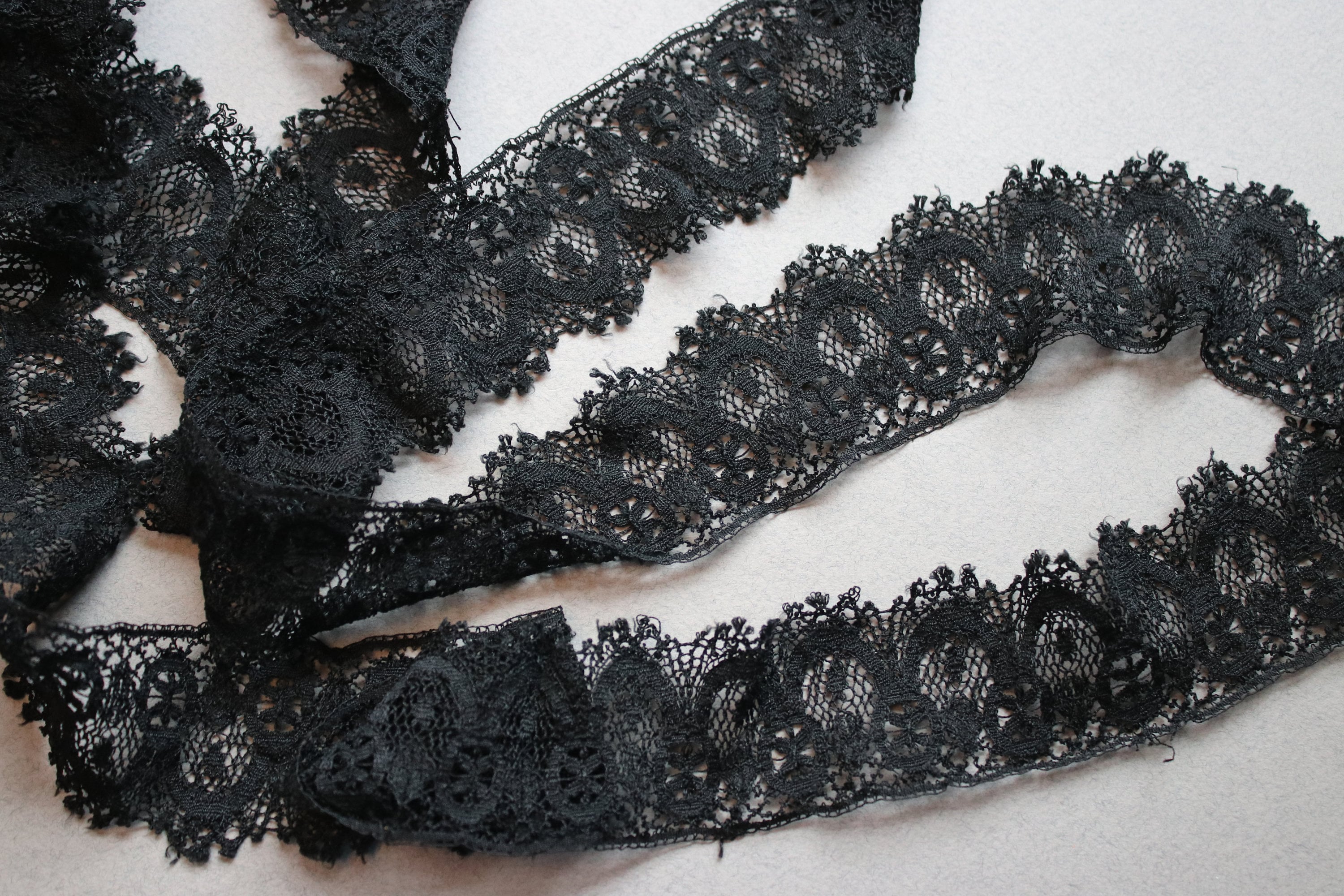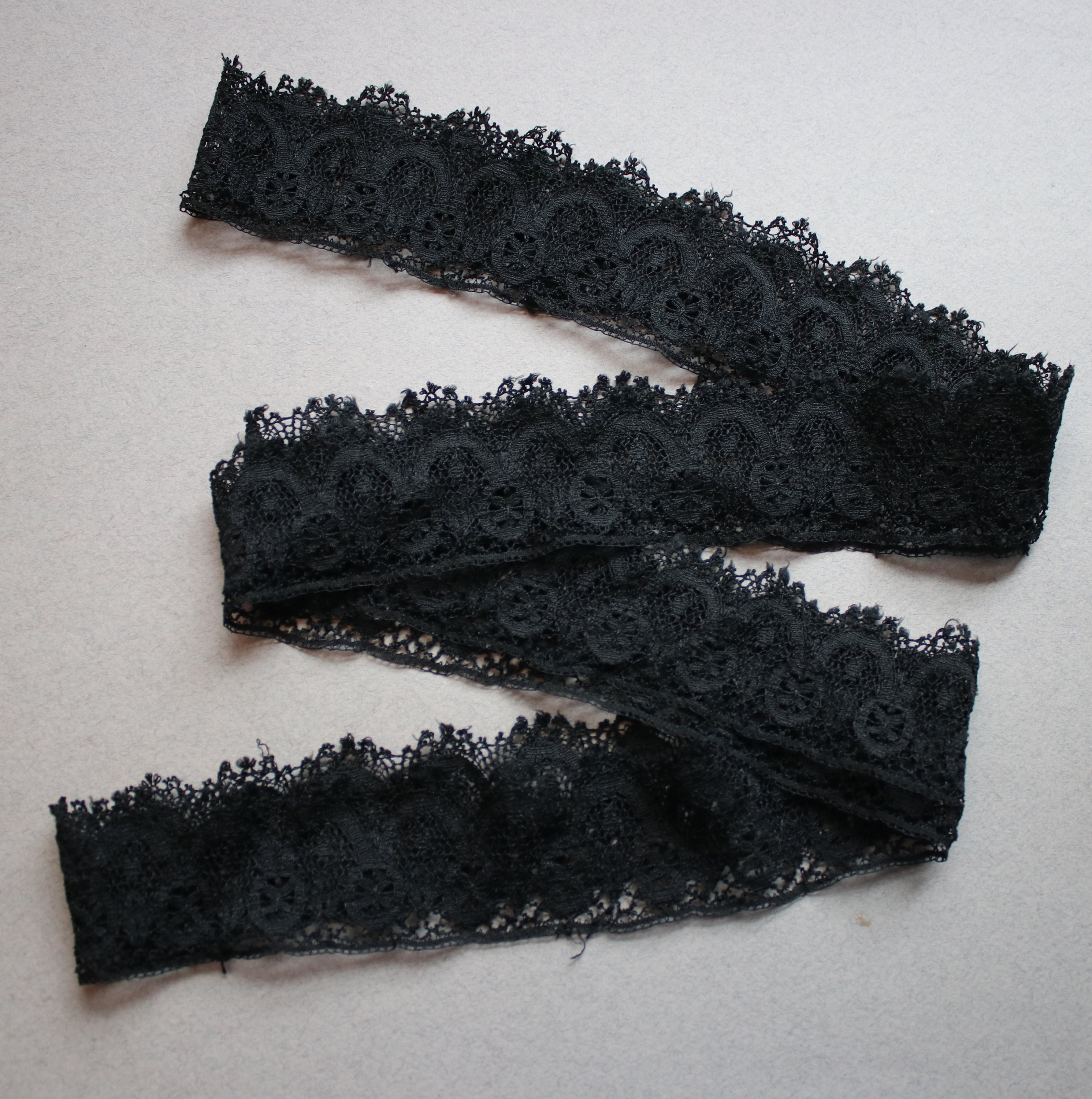 Measuring 78" in length (39" when held together as one continuous strip), this loop of Victorian black lace is in very good condition. While it does have wear commensurate with age and use, it is still lovely and ready for a project. I've shown the lace in the last photo as one long strip, but since it is a loop, you may choose to cut it for use.