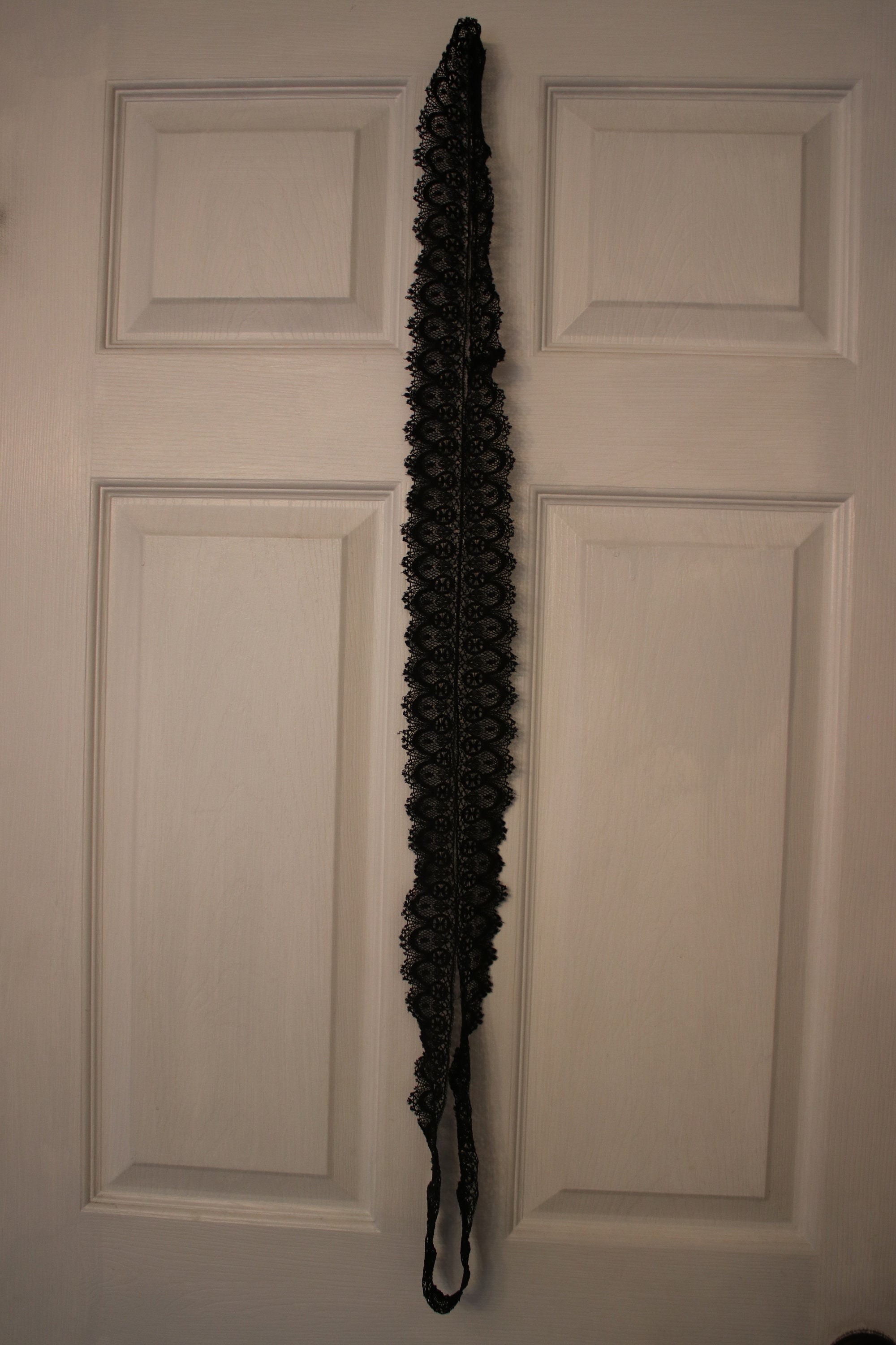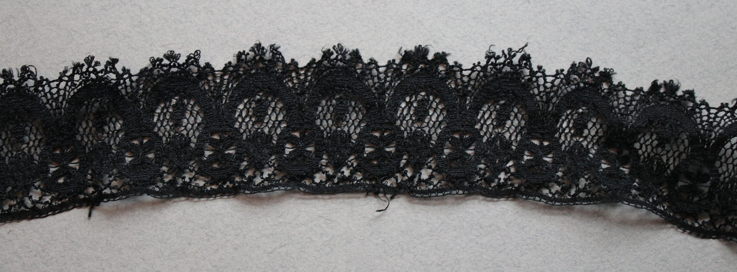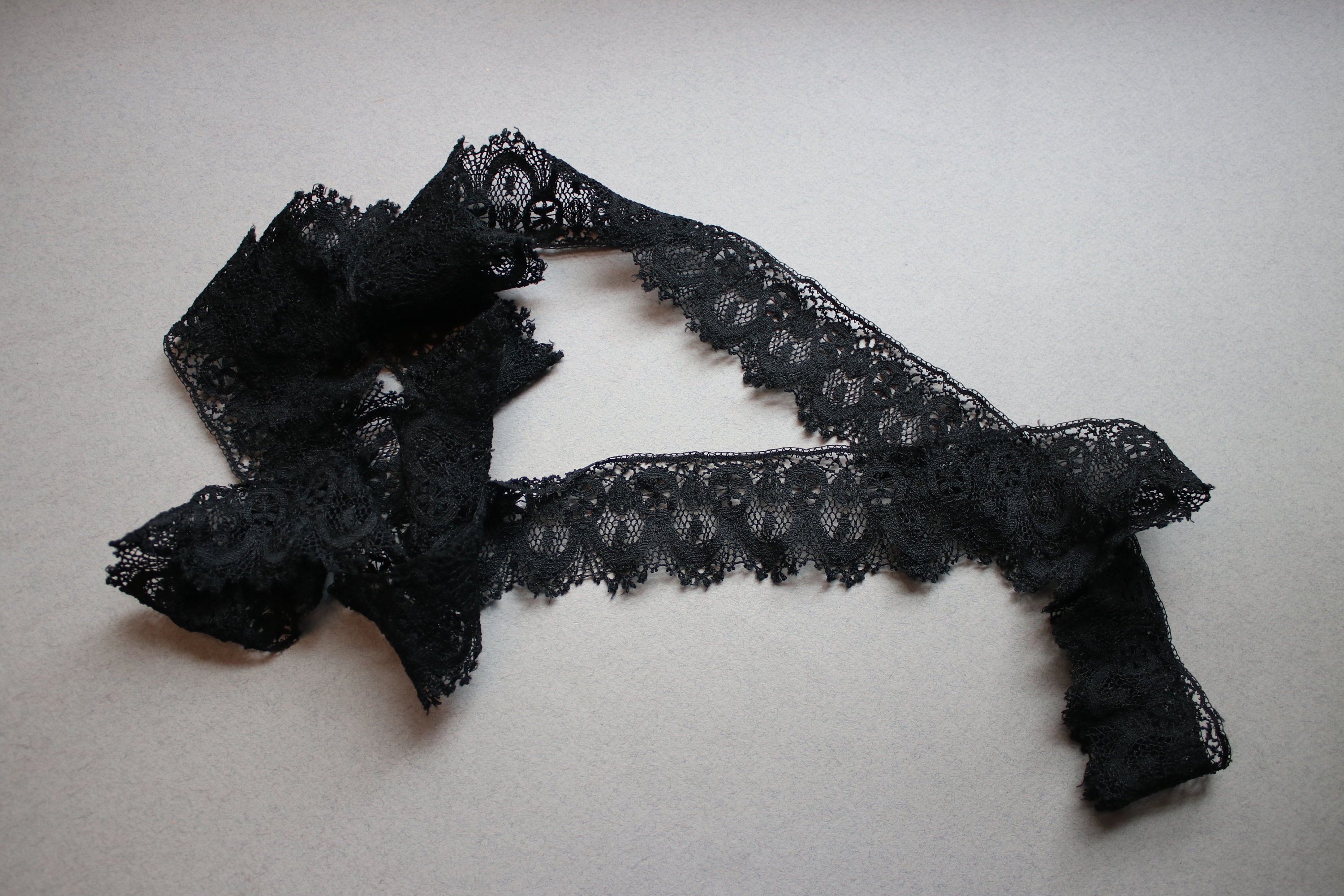 Measuring 78" in length (39" when held together as one continuous strip), this loop of Victorian black lace is in very good condition. While it does have wear commensurate with age and use, it is still lovely and ready for a project. I've shown the lace in the last photo as one long strip, but since it is a loop, you may choose to cut it for use.