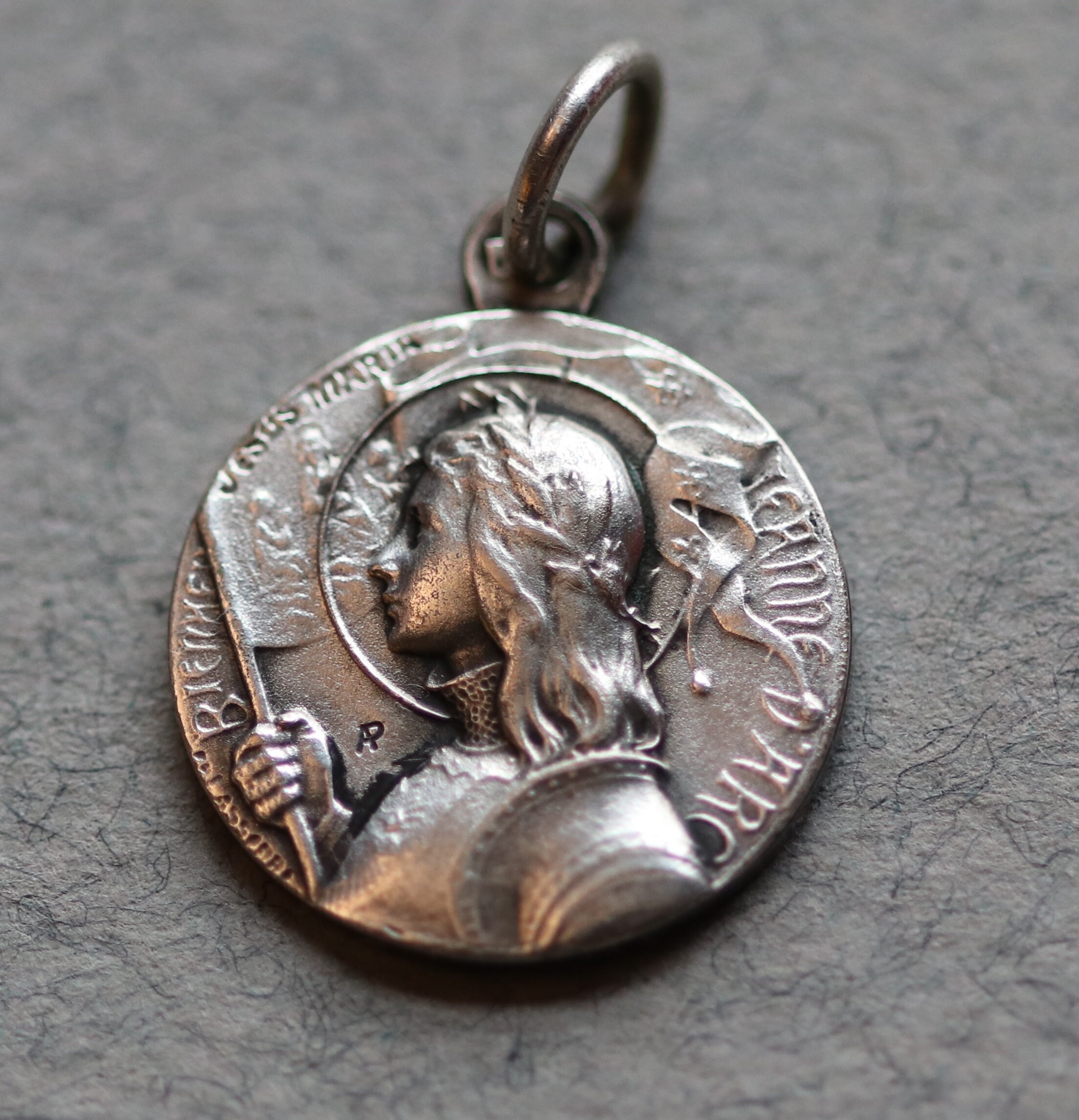 This Jeanne d'Arc medal was purchased from France and is an original of an oft copied piece. I have not had it tested for silver content but there are marks (though not easily identifiable) that lead me to believe it does have silver content. It was sold as silver, but I don't want to give a definitive answer since I am uncertain as to the marks.