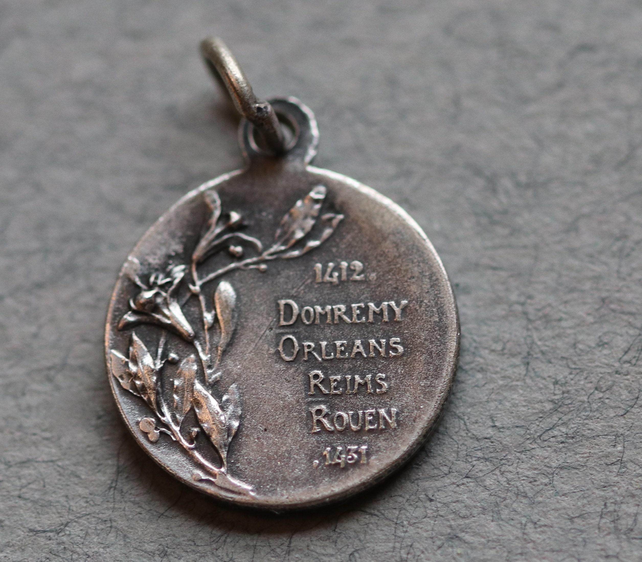 There is a mark on the bale as well as two letters to the lower left of Joan's tunic, which are AP (Adolphe Penin, a French medalist who lived from 1888-1985 and who was a master engraver). Additionally, there is the name Lasserre (Pierre Firmin Lasserre, another French medalist) stamped along the pendant's edge.