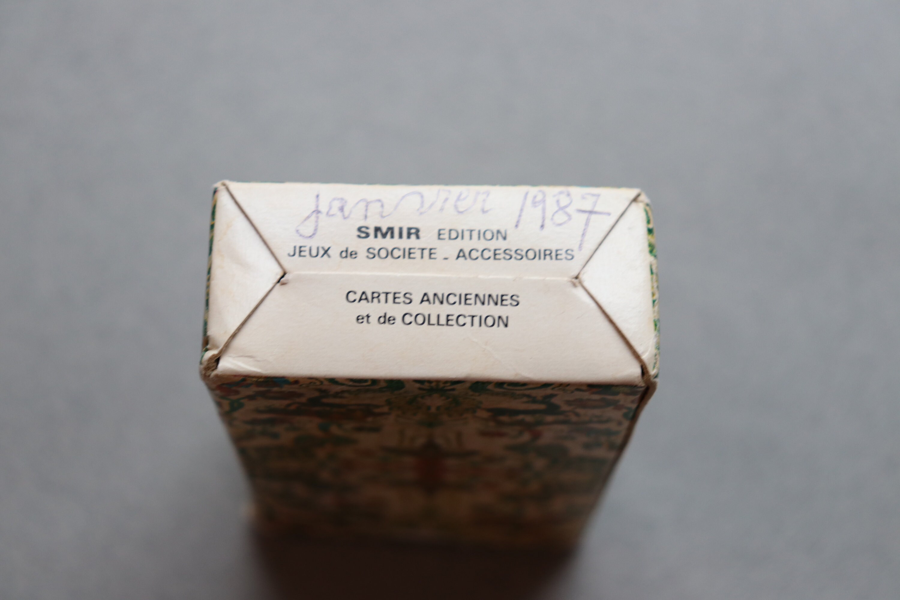 The deck consists of 78 cards. The box exhibits wear to the front and back, sides, top, and bottom. Please see the last photo for the worn area on the top of the box where it is missing some of the design. Also, there is inked writing on the bottom of the box: Janvier 1987.
