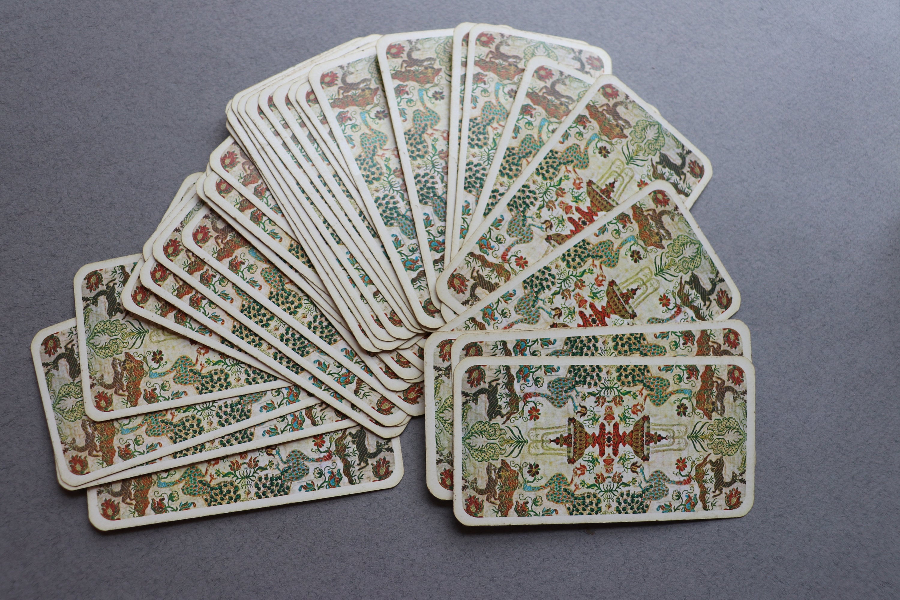 Condition: The deck has surface wear; soiling, particularly around the cards' edges; and discoloration (owing to age and handling) on the front and back of each card. Because of limited photo space, I've not been able to show the cards in their entirety, but if you would like more photos of the deck, please don't hesitate to ask as I'll be happy to oblige. Also, no rules are included.
