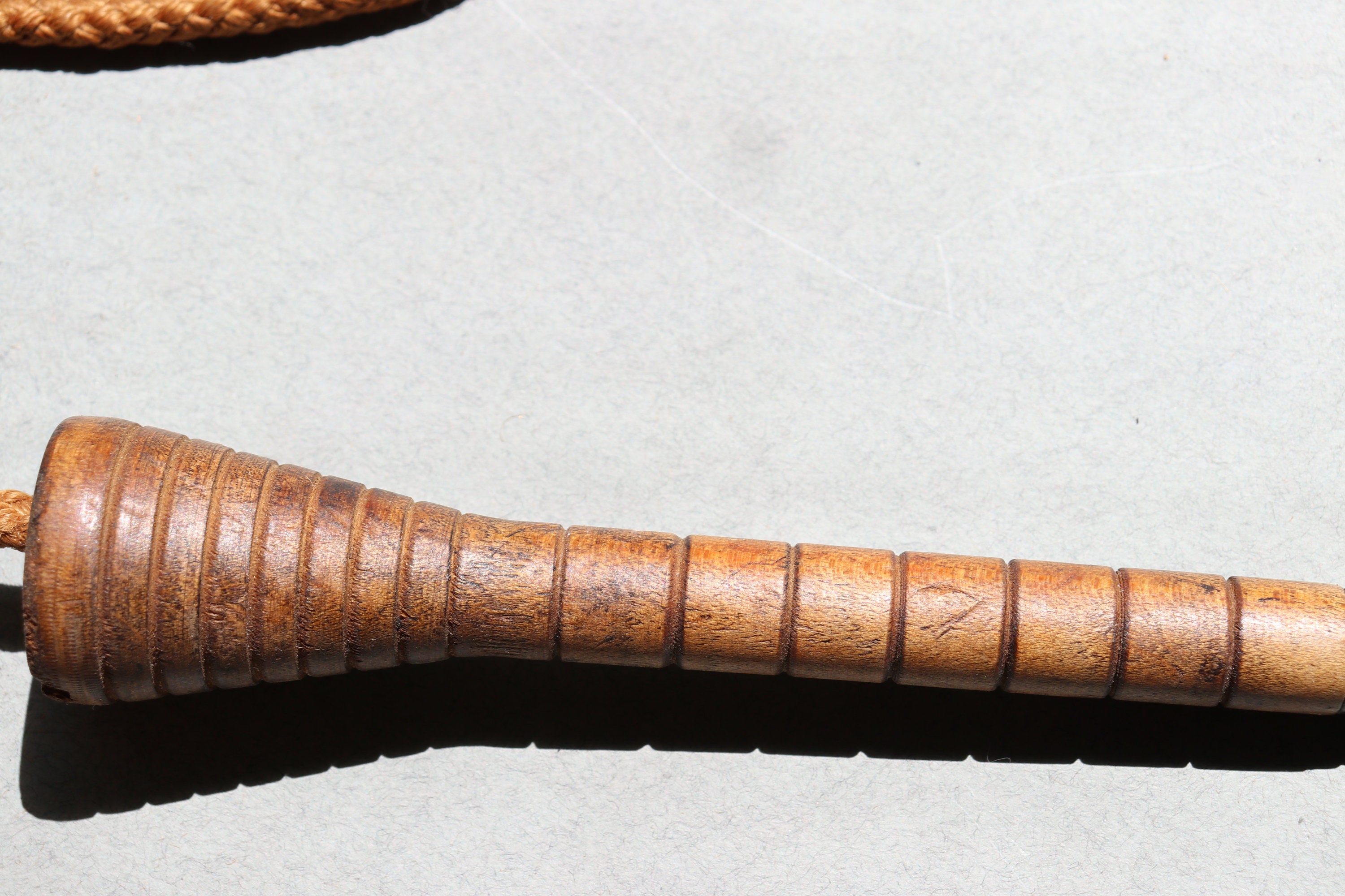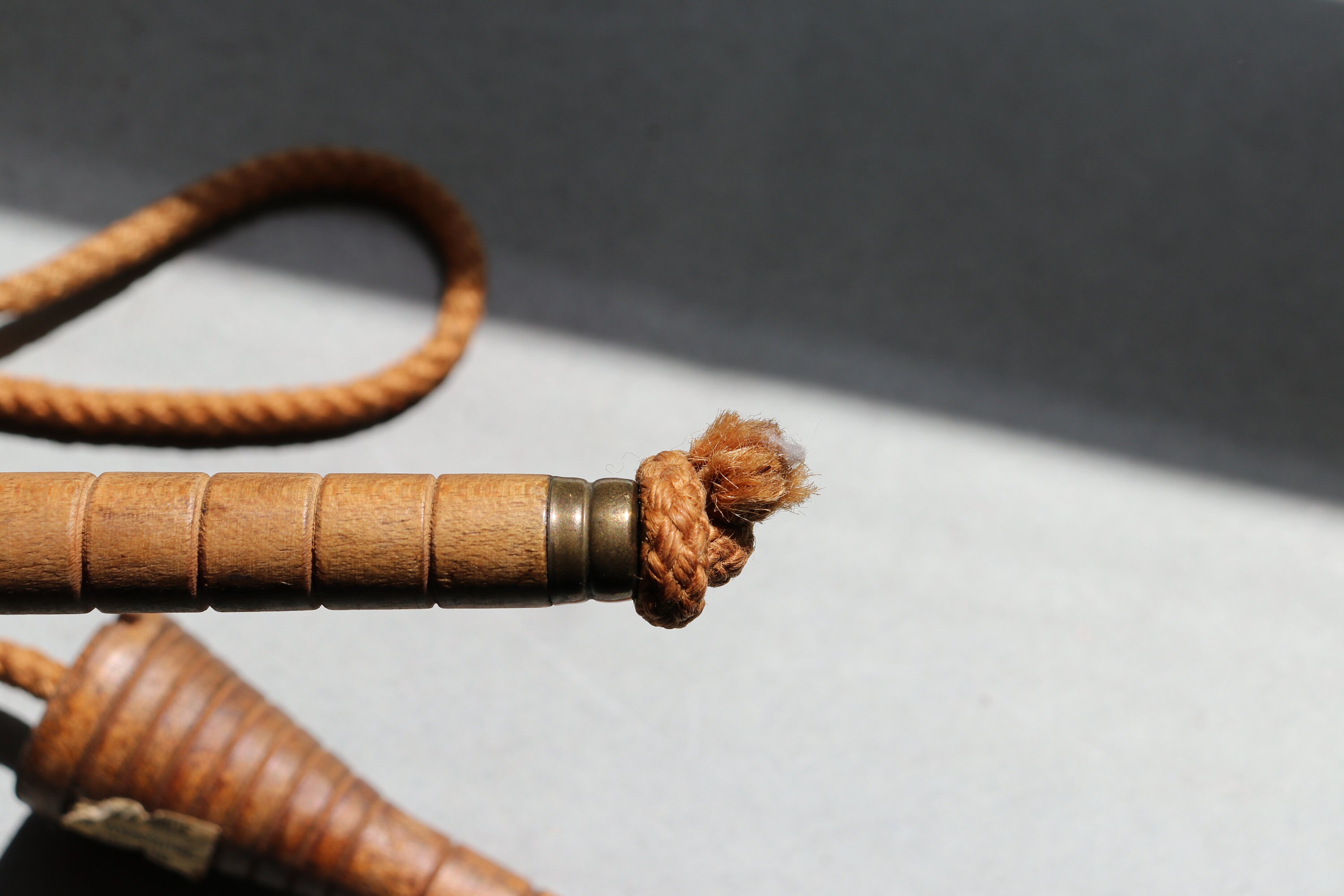 This jump rope of indeterminate age (but definitely vintage) is comprised of jute and wooden bobbin handles. It bears a label that reads "Hand Made in Yorkshire England."